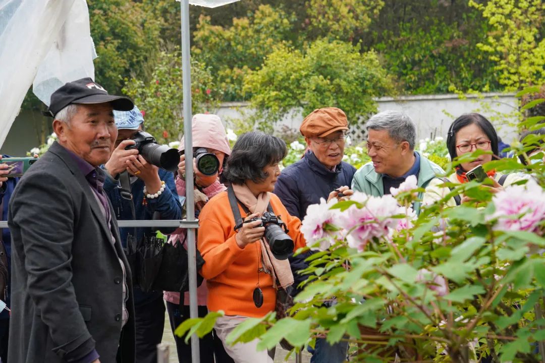 金书林(左一)和慕名而来的牡丹爱好者。