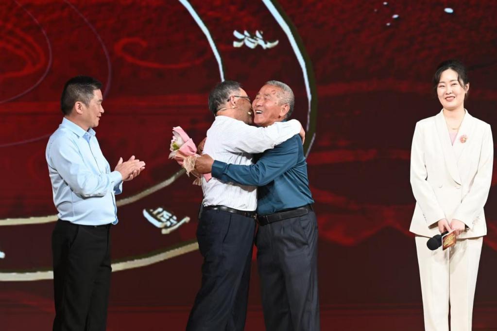 活动上,“江南第一牡丹”第22代守护人金书林家庭现场讲述了传家宝牡丹花的故事,董其昌在上海的后人也来到了活动现场,舞台上,两位古稀老人为这份500年前的信守诺言而真情相拥。同时,奉贤邬桥学校合唱团倾情演唱《牡丹花开》。活动前,金书林的儿子金国强和孙媳纪文琴,向澎湃新闻记者讲述了金家“花语传家”背后的温情与传承。