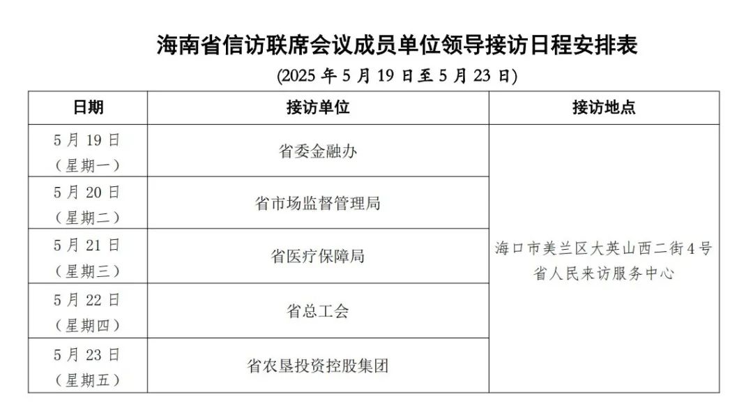 5月19日至5月23日海南省直属单位领导接访日程公布。详情(来源:新海南客户端)
