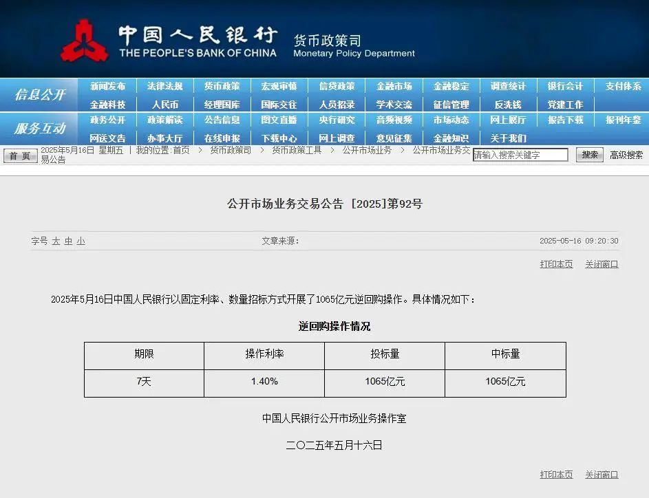 据中国人民银行官网消息,2025年5月16日中国人民银行以固定利率、数量招标方式开展了1065亿元逆回购操作。详情(来源:央视新闻)