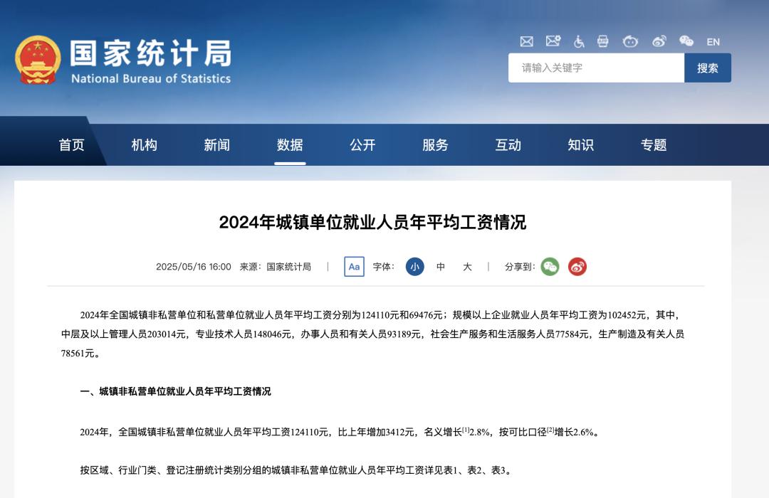 5月16日,国家统计局发布《2024年城镇单位就业人员年平均工资情况》。详情(来源:国家统计局)