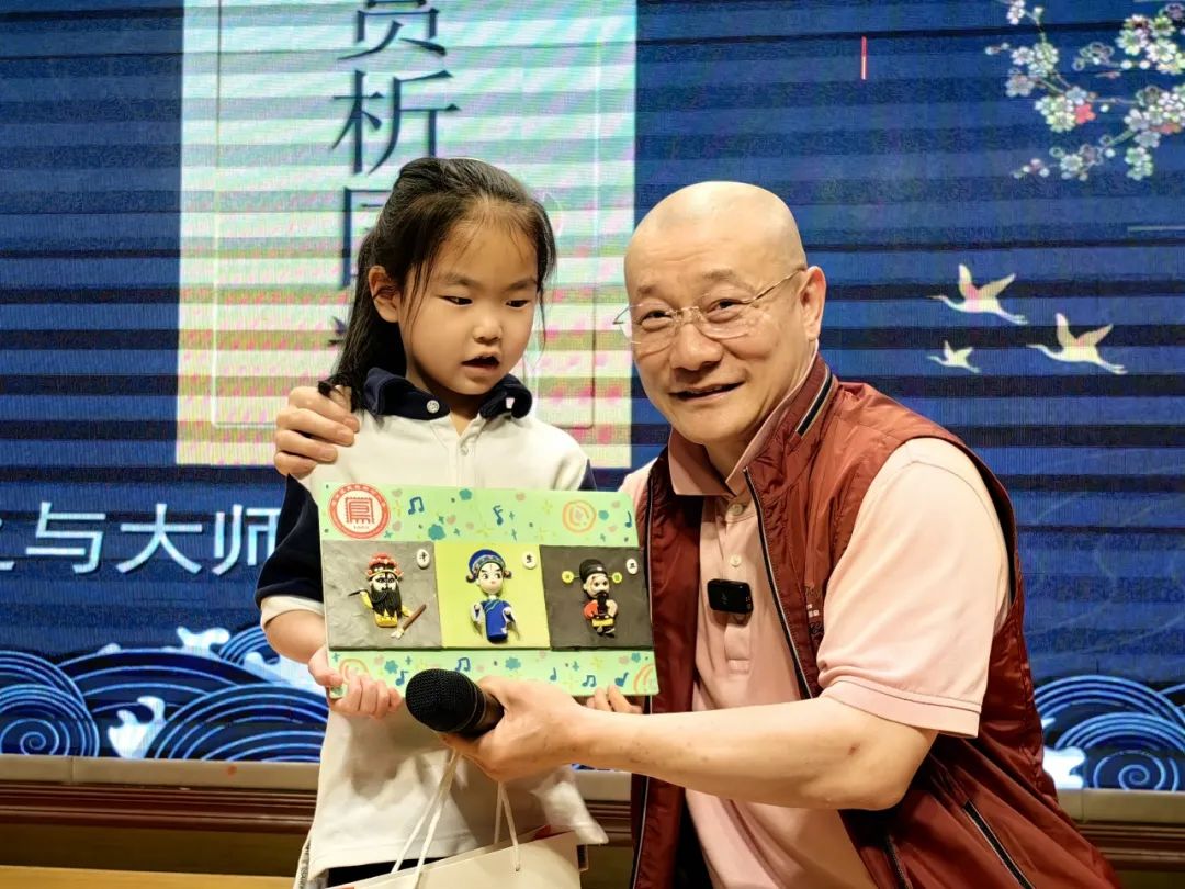 四年级的刘星妤同学还带来昆曲《牡丹亭》选段展示,婉转的曲调尽显传统戏曲的典雅之美。最后,一年级的李恬安小朋友为安老师送上我校面塑社团学生亲手制作的面塑作品,用非遗手作致敬国粹。