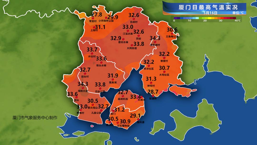 昨日气温热力图一片“红彤彤”,不少站点直逼34℃,最高温出现在海沧区海翔大道,达到34.3℃,距离35℃高温线仅一步之遥。最低气温在18℃-24℃,入夜后气温相对舒适,相比白天要凉快不少。