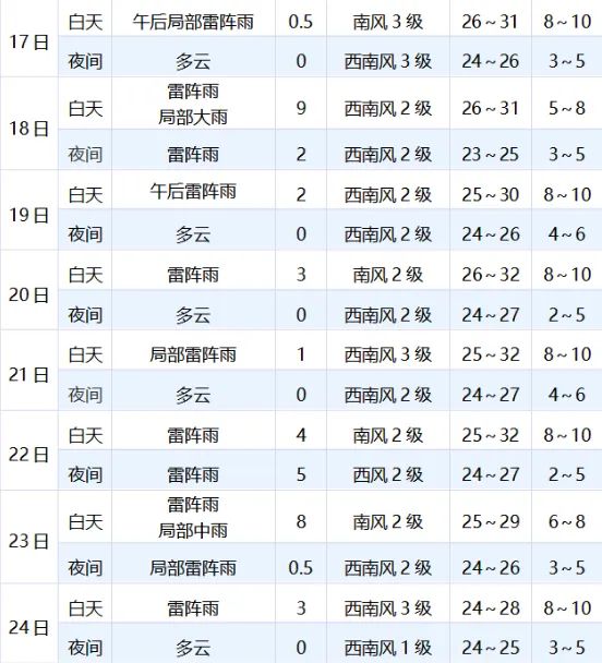 雷雨天气即将上线,并可能一直延续到下周五。降水时,局地还将伴有短时强降水、雷雨、大风等强对流天气。气温方面,未来七天气温普遍较高,最高气温在29℃-32℃,最低温也在24℃-25℃。未来几天的天气情况