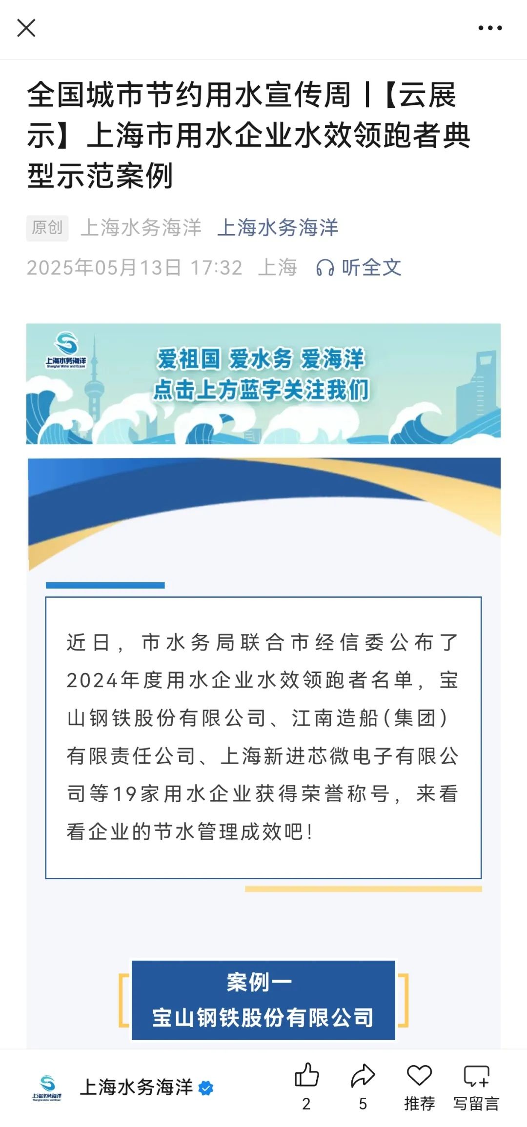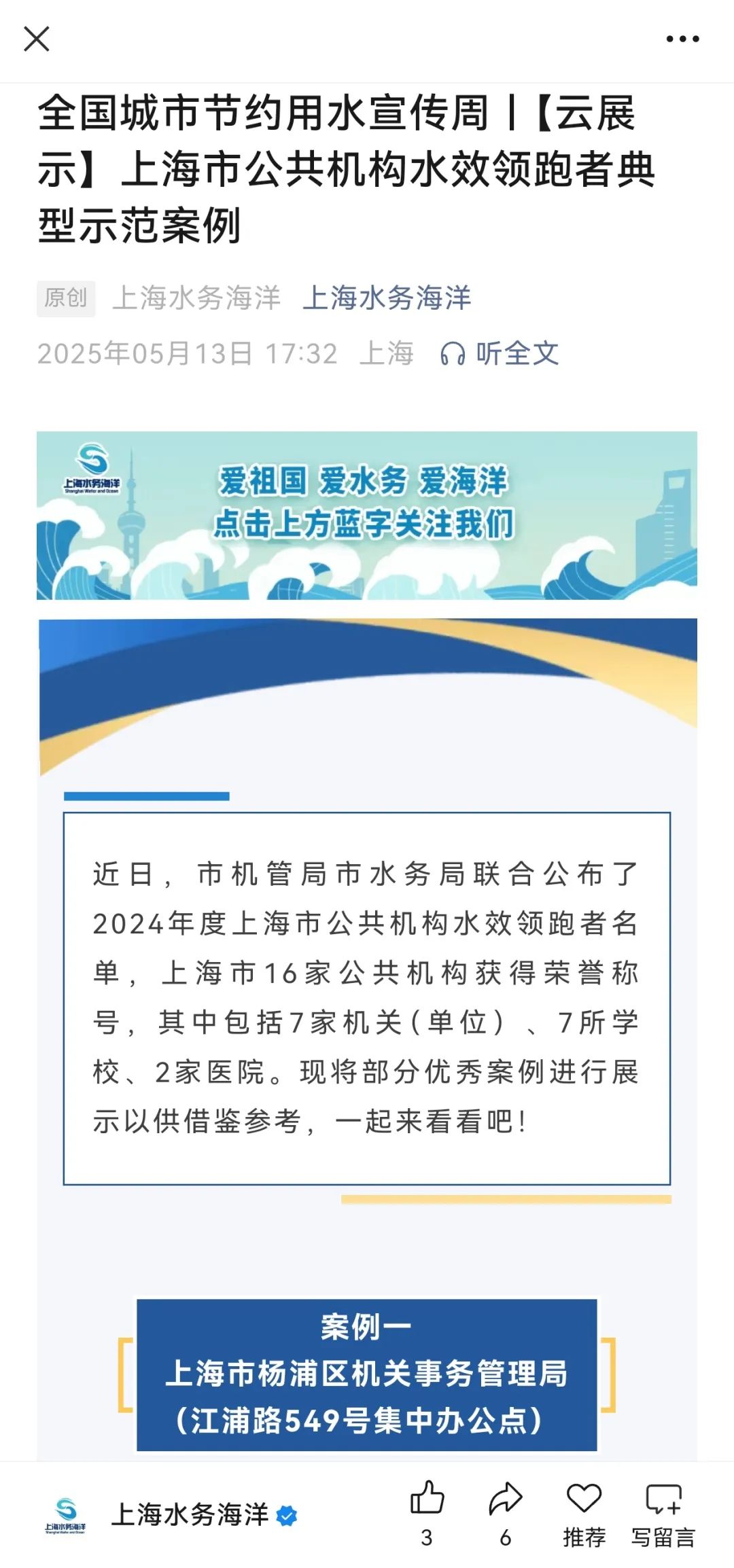市相关部门遴选出一批用水指标先进、节水成效突出且具有典型经验的用水企业、工业园区和公共机构,汇编其节水工作亮点与实践成果,通过“上海水务海洋”微信公众号向社会公开展示,充分发挥对标达标优秀企业的引领作用,引导全社会深刻认识水资源可持续利用的重要性,推动形成“学标杆、创标杆”的节水风尚,助力实现水资源高效利用与社会经济协调发展的良性互动。