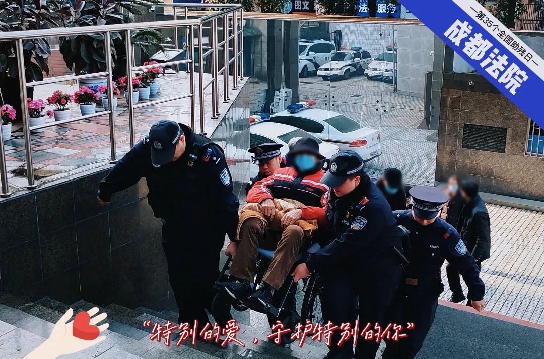 成都中院法警护送腿脚不便、需坐轮椅的当事人前往法庭开庭,为残疾当事人铺就一条畅通无阻的公平正义之路。