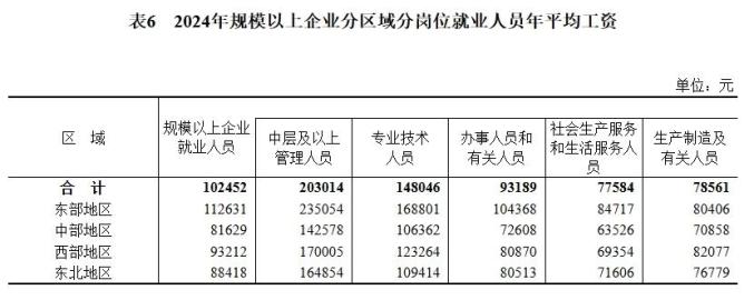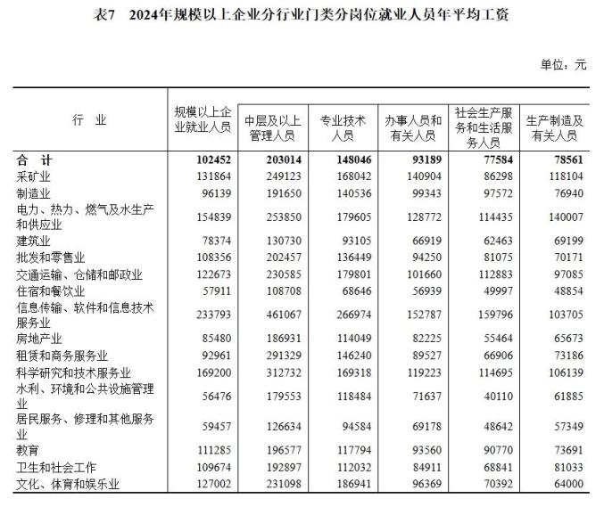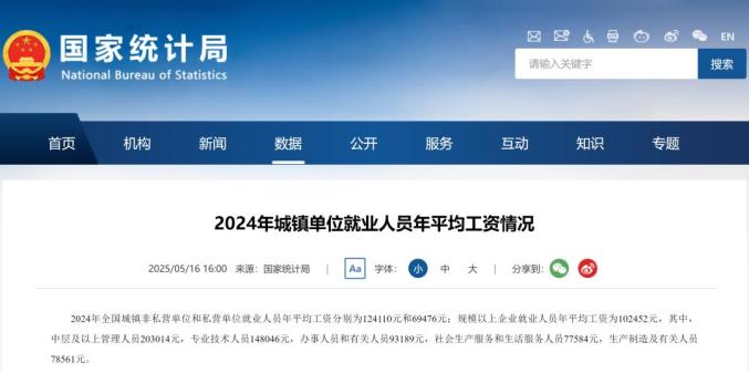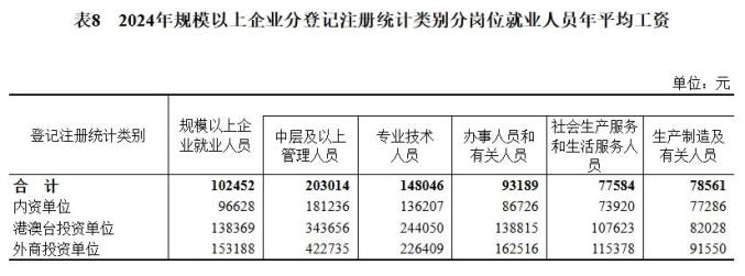 2024年全国城镇非私营单位和私营单位就业人员年平均工资分别为124110元和69476元;规模以上企业就业人员年平均工资为102452元,其中,中层及以上管理人员203014元,专业技术人员148046元,办事人员和有关人员93189元,社会生产服务和生活服务人员77584元,生产制造及有关人员78561元。