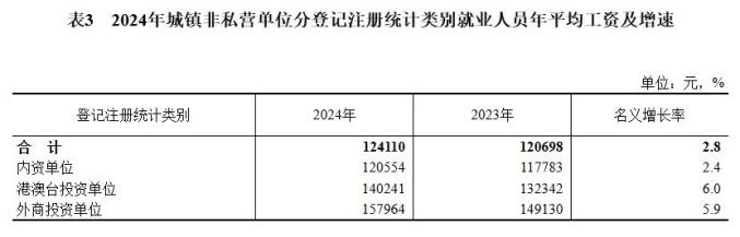 2024年,全国城镇非私营单位就业人员年平均工资124110元,比上年增加3412元,名义增长2.8%,按可比口径增长2.6%。