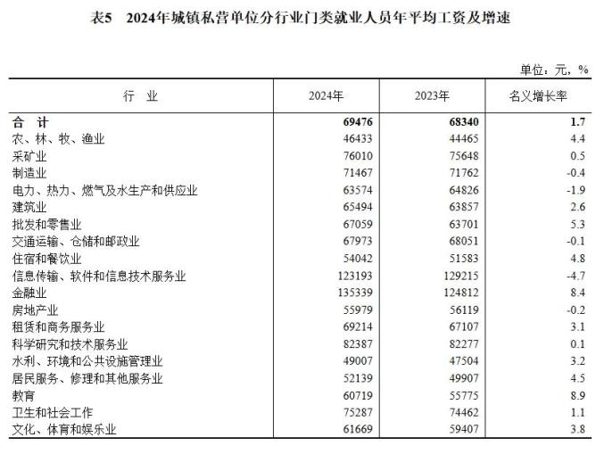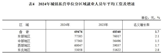 2024年,全国城镇私营单位就业人员年平均工资69476元,比上年增加1136元,名义增长1.7%,按可比口径增长4.0%。