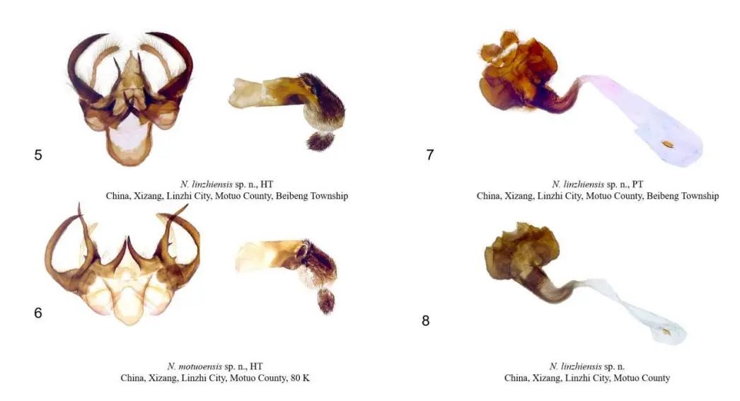 新种林芝靓毒蛾和墨脱靓毒蛾 雌雄性外生殖器图(欧阳思琪拍摄)2025年3月潘朝晖团队在整理标本时发现了林芝靓毒蛾和墨脱靓毒蛾两个新种,其模式产地分别是墨脱县背崩乡和80K(达木乡),因此分别以林芝和墨脱2个地名命名毒蛾亚科靓毒蛾属2新种。
