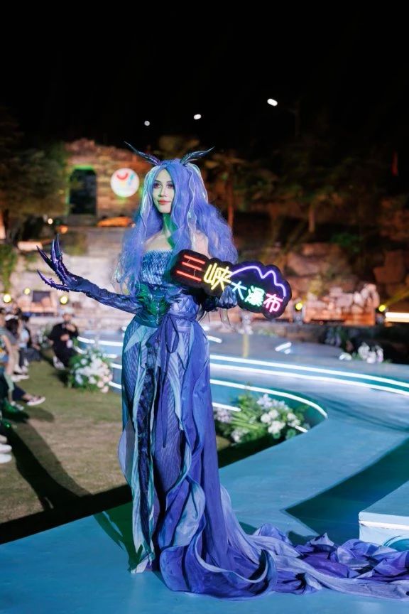纤夫号子声中,模特踏着光影的潮汐款款而来-衣袂翻卷着三峡云雾的飘逸,剪影勾勒出长街巷尾的烟火,刺绣暗藏土家织锦的密码,金属光泽折射大坝的磅礴。当江水裹挟星光奔涌,峡江的印记在霓虹与山河间跃动。