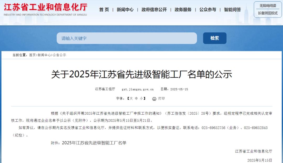 2025年江苏省先进级智能工厂名单