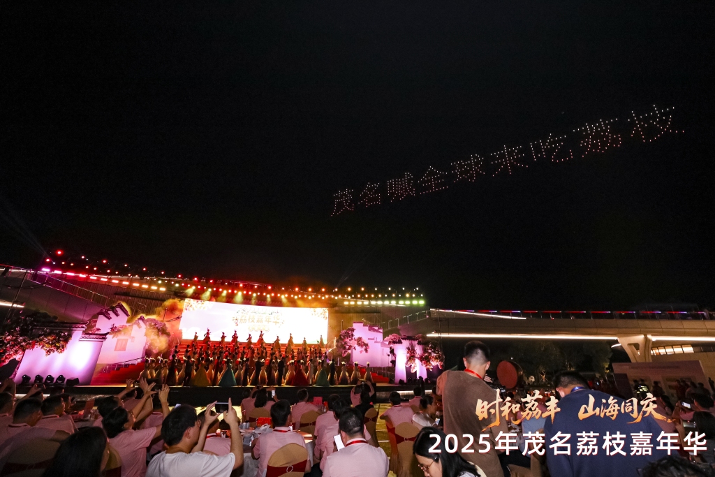 5月19日,2025年茂名荔枝嘉年华“美荔之夜”现场上空,无人机排出“茂名喊全球来吃荔枝”的图案。 主办方 供图