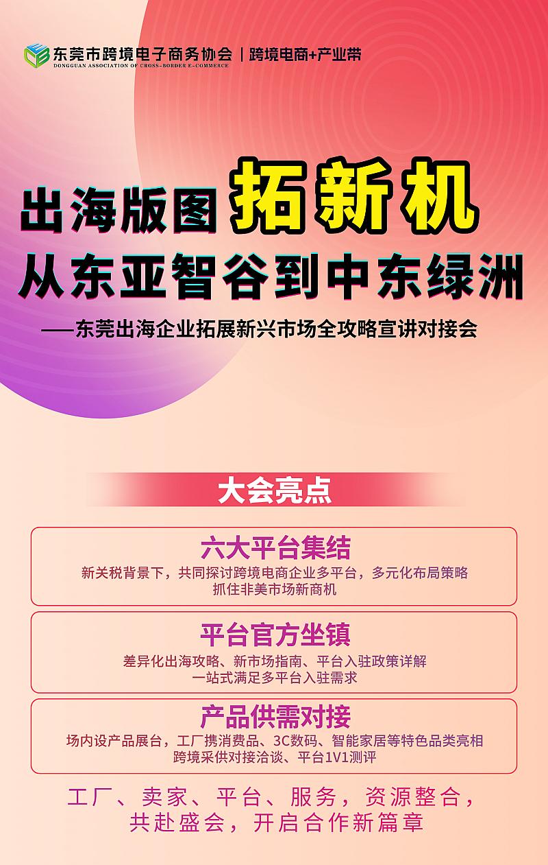 为助力东莞企业精准把握新兴市场机遇,实现出海版图的全新拓展,由东莞市商务局、松山湖管委会指导,东莞市跨境电商协会主办的“重构出海版图:从东亚智谷到中东绿洲——东莞出海企业拓展新兴市场全攻略宣讲对接会”将于5月22日盛大启幕。