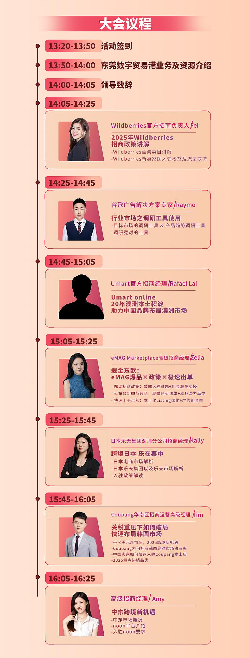 本次宣讲对接会聚焦俄罗斯、中东等极具潜力的新兴市场,特别邀请了来自Wildberries(俄罗斯)、Umart(澳大利亚)、eMAG(东欧)、乐天(日本)、Coupang(韩国)、noon(中东)多个国家和地区的知名跨境电商平台,各大平台在各自区域市场拥有庞大的用户基础、成熟的运营体系和广泛的商业影响力,将为东莞企业搭建起通往新兴市场的“黄金桥梁”。活动现场,各电商平台代表将围绕平台特点、市场趋势、入驻政策、运营技巧等方面进行深入解读。从东亚市场的消费习惯、文化差异到中东市场的政策法规、商业机遇,为企业提供全方位、一站式的出海攻略。
