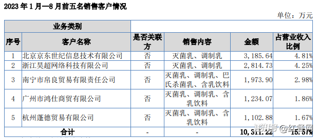 重押电商平台,为百菲乳业带来了可观收入。2021、2022年、2023年前8月,京东、天猫这两家头部电商平台,均位列百菲乳业的前五大客户。2023年前8月,京东、天猫就为其贡献了约6000万元收入,在总营收的占比接近一成。