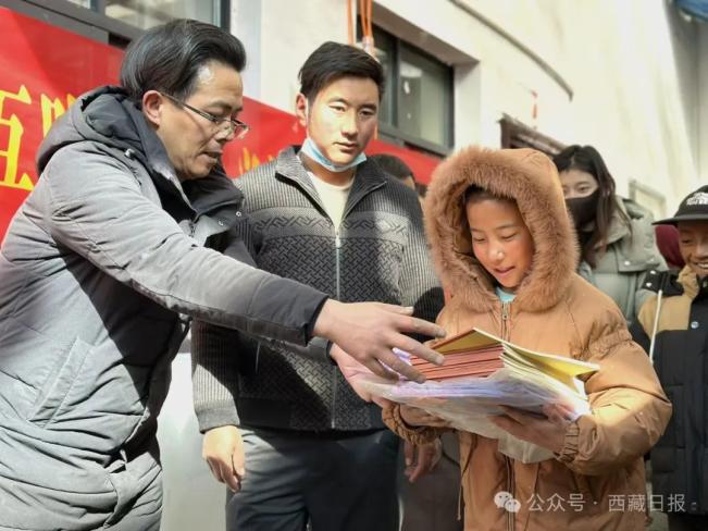 图为那曲市嘉黎县藏比乡美巴尔村驻村工作队员正为学生发放学习用品。记者 曲珍 通讯员 衡猛 摄