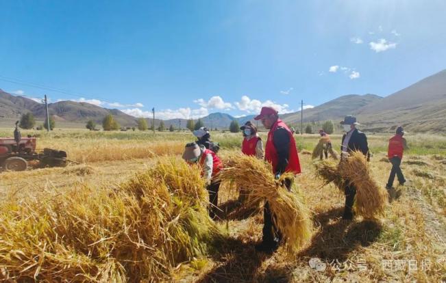 图为日喀则市江孜县日朗乡措麦村第十三批驻村工作队深入田间地头帮助无劳力家庭秋收。(图片由西藏自治区党委组织部提供)