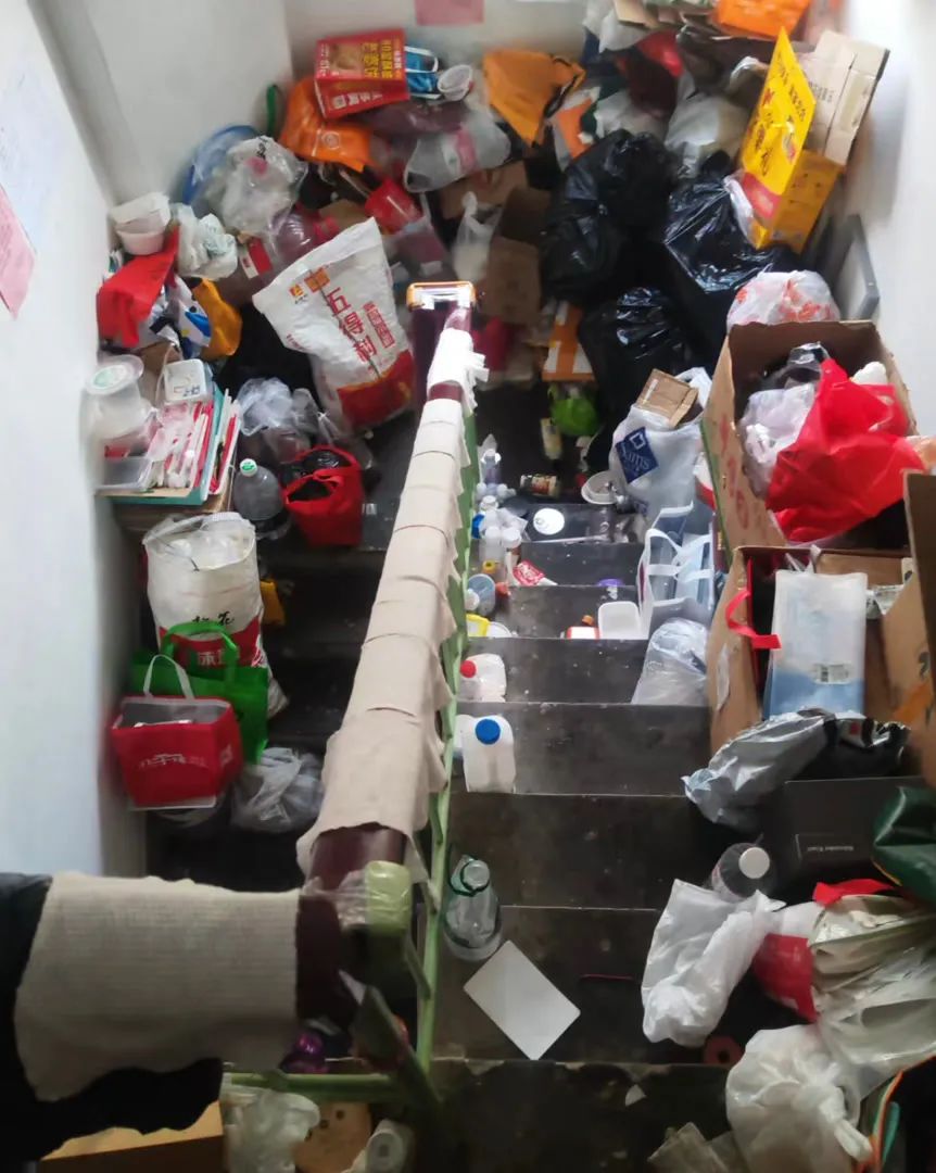 此前,面对劝导教育和协助清理,这位61岁的张阿姨拒绝配合、屡教不改。为彻底消除隐患,5月19日下午,街道、社区联合消防、城管和公安等部门督导物业开展强制清理工作,最终清理出17个编织袋的垃圾。