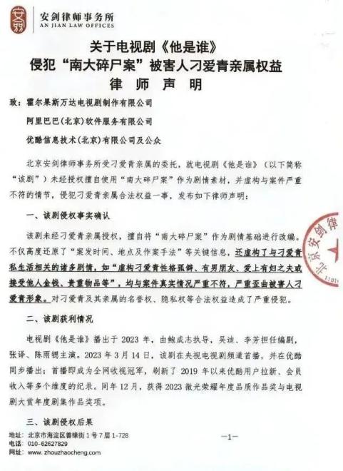 律师声明称,电视剧《他是谁》未经刁爱青亲属授权,擅自将“南大碎尸案”作为剧情基础进行改编,不仅高度还原了“案发时间、地点及作案手法”等关键信息,还虚构了与刁爱青私生活相关的诸多剧情,如“虚构刁爱青性格孤僻、有男朋友、爱上有妇之夫或接受他人金钱、贵重物品等”,均与案件真实情况严重不符,严重歪曲被害人刁爱青形象。对刁爱青及其亲属的名誉权、隐私权等合法权益造成了严重侵犯。要求电视剧《他是谁》的制作方、播出平台及相关责任人立即停止所有侵权行为,包括但不限于停止播放侵权内容的剧集、删除相关宣传资料、下架相关衍生品等,并在公开渠道发布诚恳道歉声明,以消除不良影响。