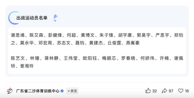 今天,广东省二沙体育训练中心公布了广东队参加本届冠军赛的运动员名单,包括老将奥运冠军谢思埸、陈艾森、巴黎奥运会女子3米跳板得主陈艺文在内的诸多名将在列,但其中并没有全红婵的名字。