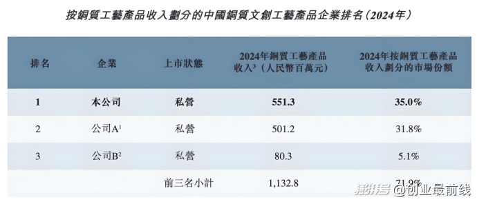 而在2024年,中国市场上铜质工艺产品收入前三名合计占据了71.9%的市场份额,即大约11.33亿元的市场规模,行业天花板非常明显。