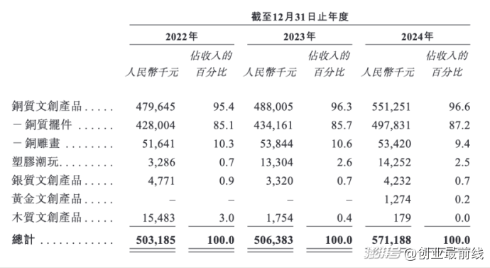 其中,铜质文创产品的营收分别约为4.8亿元、4.88亿元及5.51亿元,占比分别为95.4%、96.3%和96.6%。