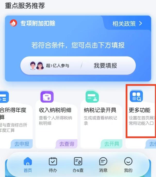 找不到“专项附加扣除”的小伙伴可以点击“更多功能”,即可添加“专项附加扣除”功能啦。