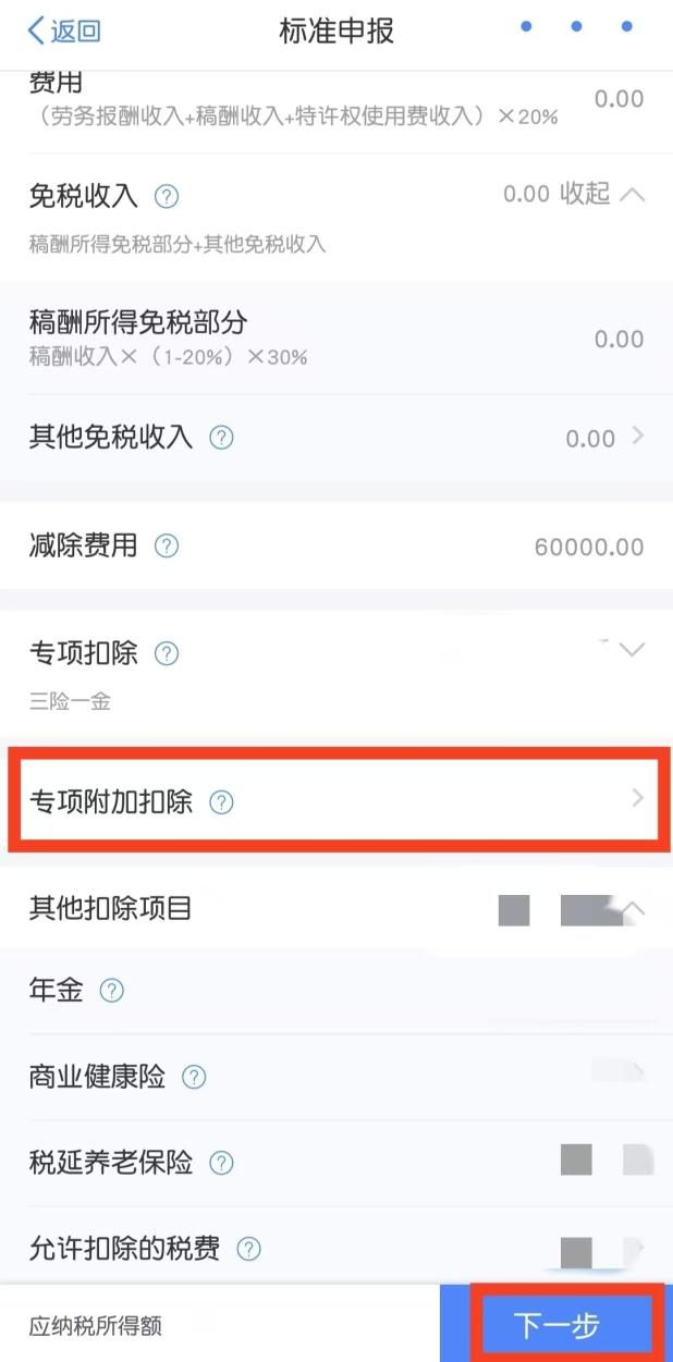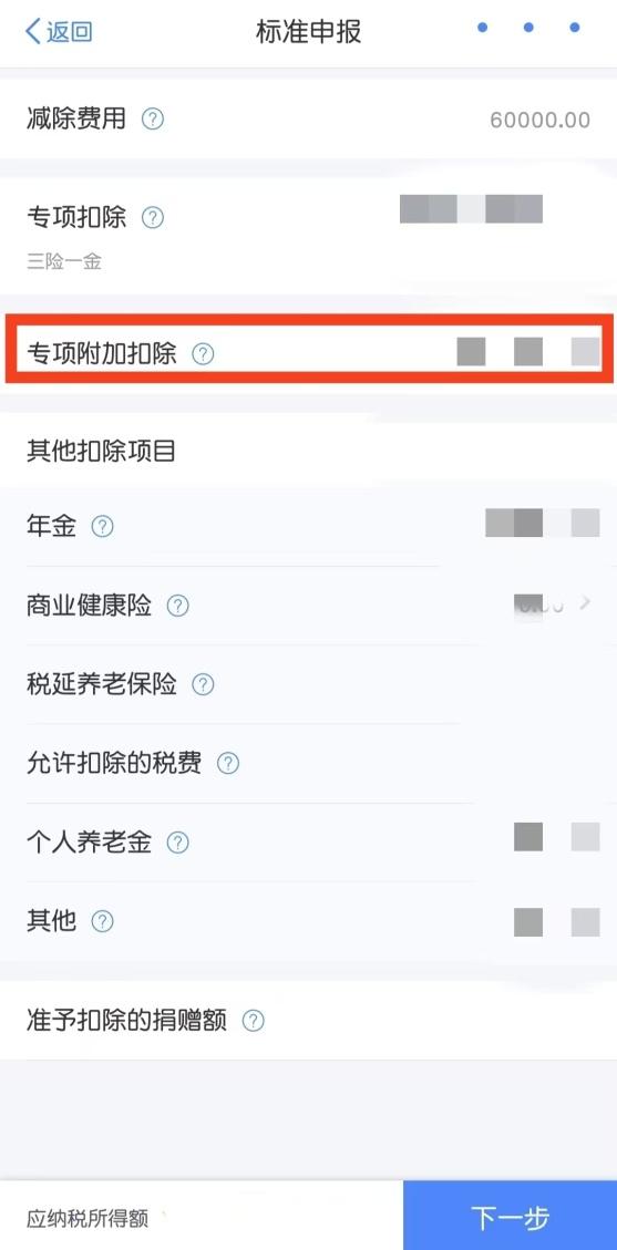 进入申报界面后,可点击“专项附加扣除”,再次核对此前填写的专项附加扣除是否成功享受,核对无误后点击“下一步”进入税款计算页面。