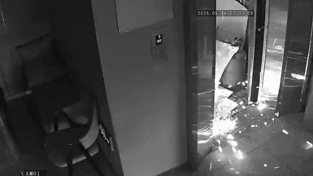 维修过程中电梯顶部持续有火花掉下来,随后电梯内的泡沫板被火花引燃。