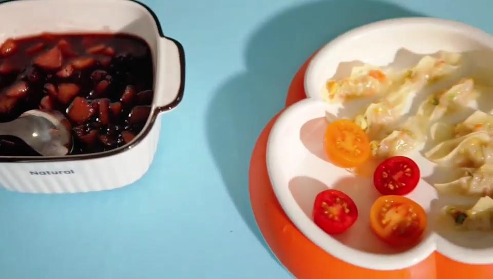 给大家介绍一顿营养全面、可口美味的宝宝小鸟餐——黑米山药苹果粥搭配迷你虾饺。