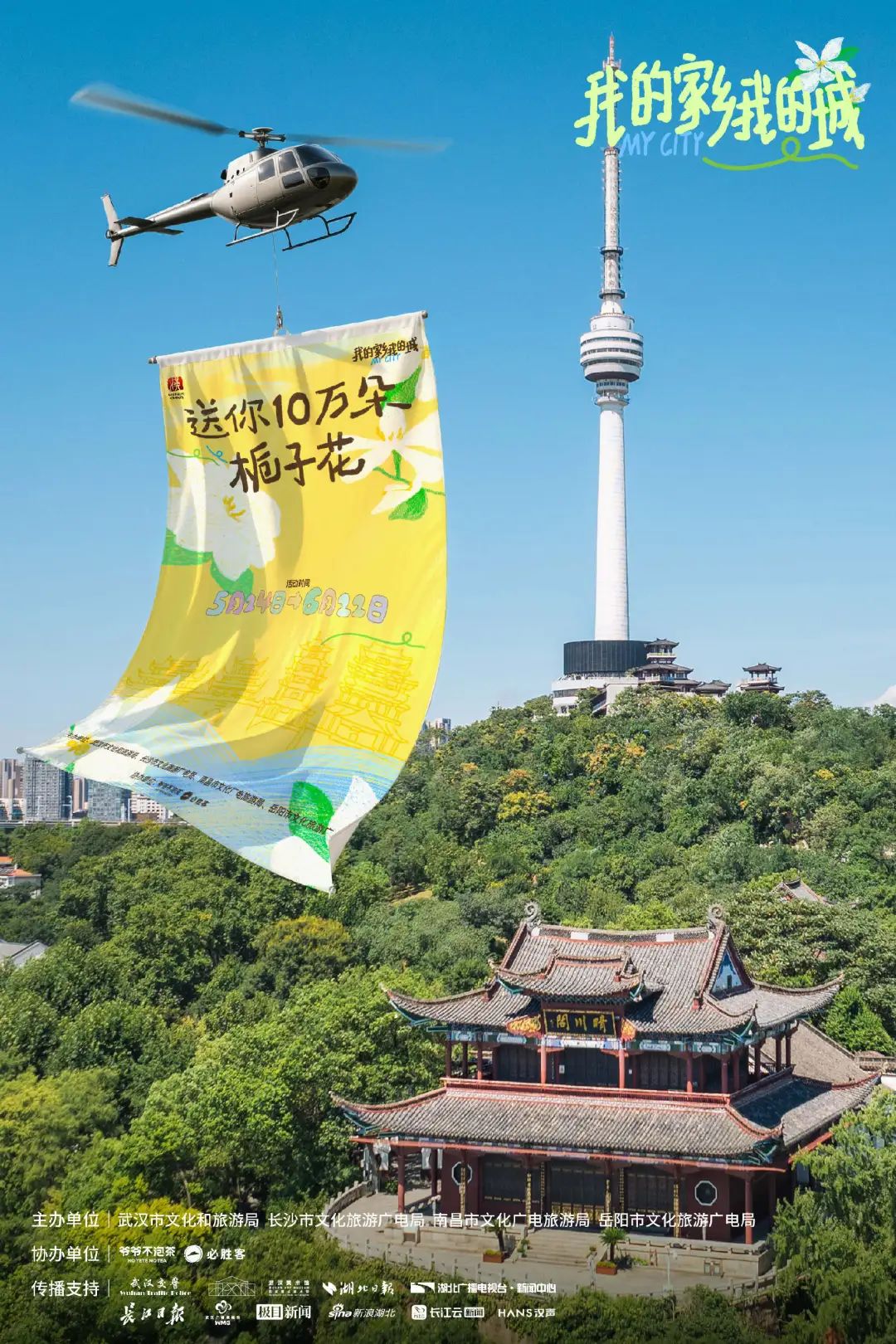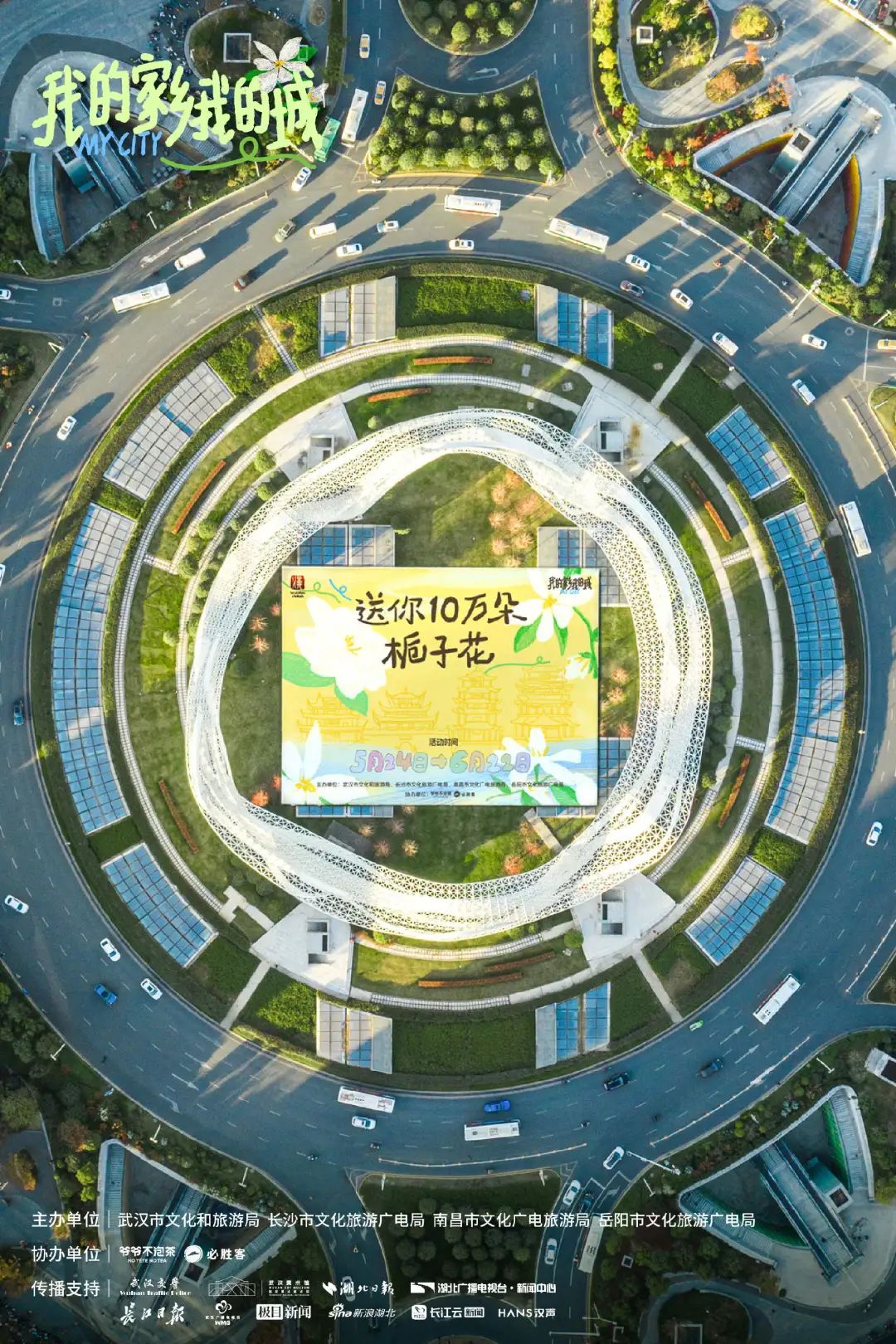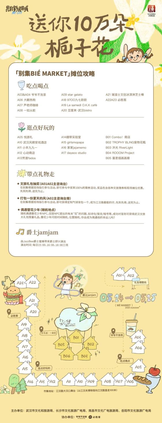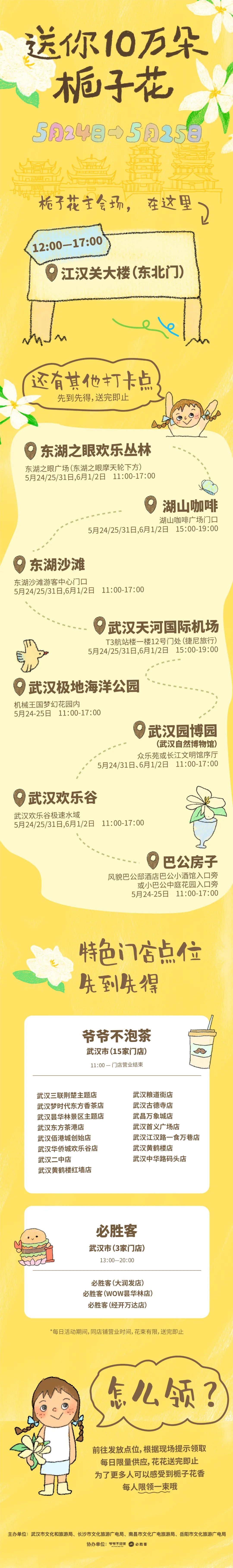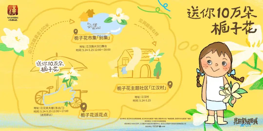 本周末,5月24日-5月25日,江汉关大楼、武汉天河国际机场、武汉各大景区、本地小店等城市角落,免费派送10万朵栀子花。