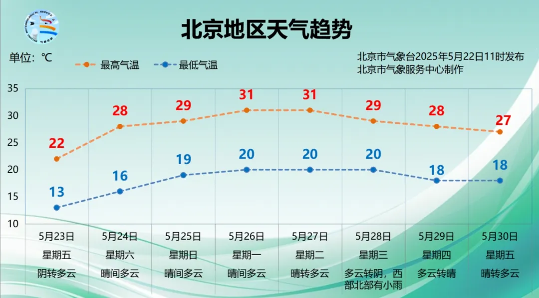 本周双休日京城天气转晴,气温将进入快速回升通道,白天最高气温在28℃至29℃之间,适宜外出郊游踏青。不过晴朗少云天气里,紫外线强,户外游玩需做好防晒,并及时补水保湿。预计5月23日至5月30日,白天最高气温22~31℃,夜间最低气温13~20℃。