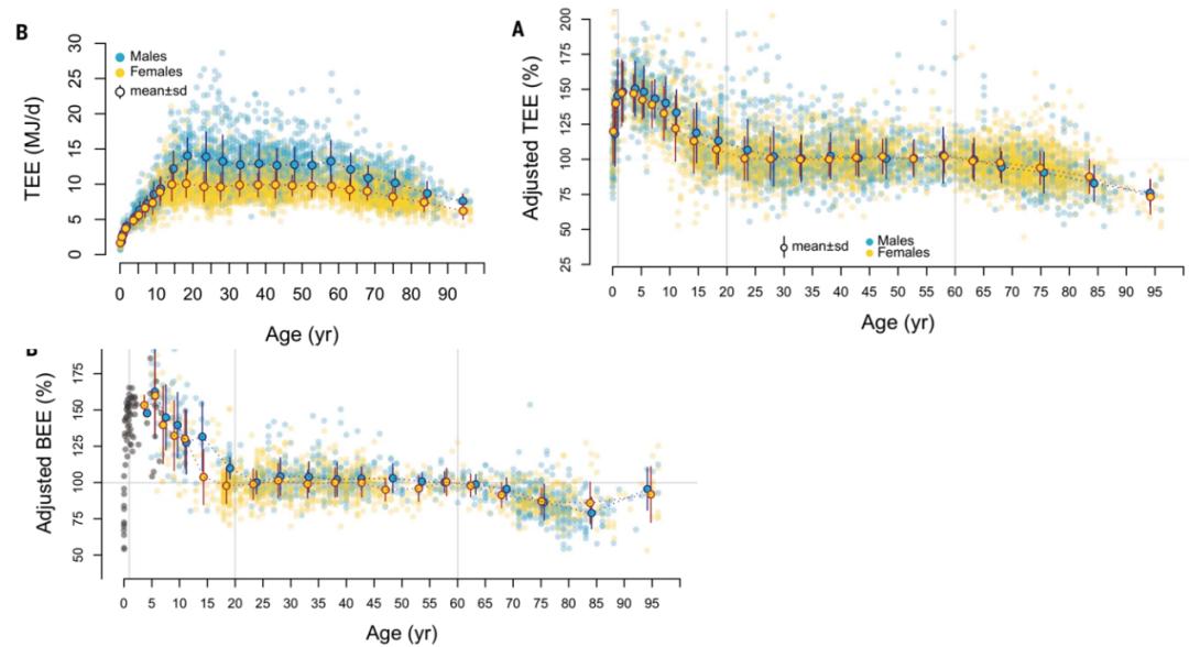 [1] Herman Pontzer, Yosuke Yamada, Hiroyuki Sagayama, et al. Daily energy expenditure through the human life course. Science. 2021. DOI: 10.1126/science.abe5017