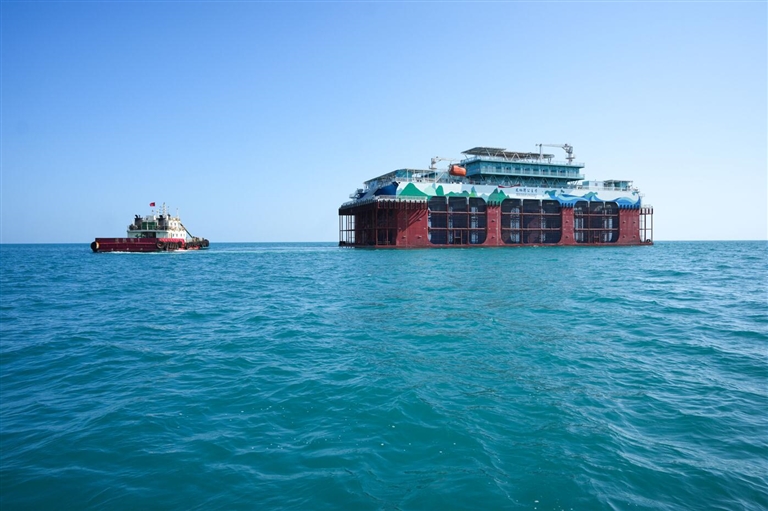 在乐东黎族自治县龙栖湾普盛海洋牧场,3座深远海智能养殖旅游平台犹如巨大的“海上宫殿”,格外壮观。