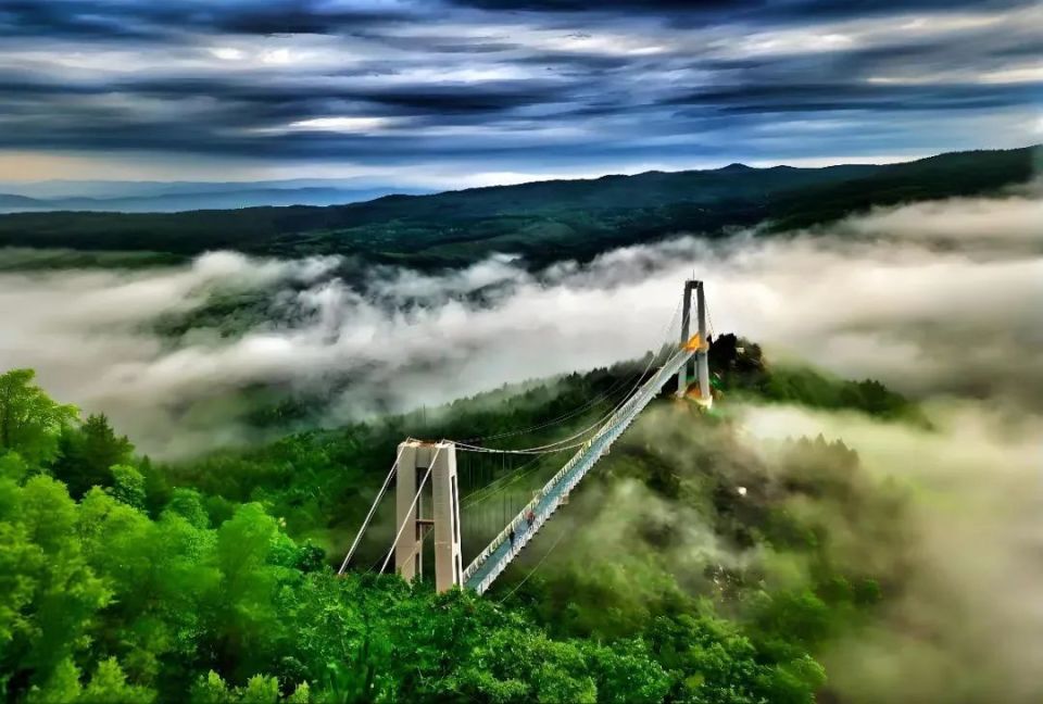 琵岩山风景区:海兰江蒸腾的水汽与山间冷空气交汇,形成 “半山流云半山翠” 的奇幻景象,260米高空之上的5D玻璃吊桥宛如一道透明长虹,串联起苍翠山脊与绵延云雾。