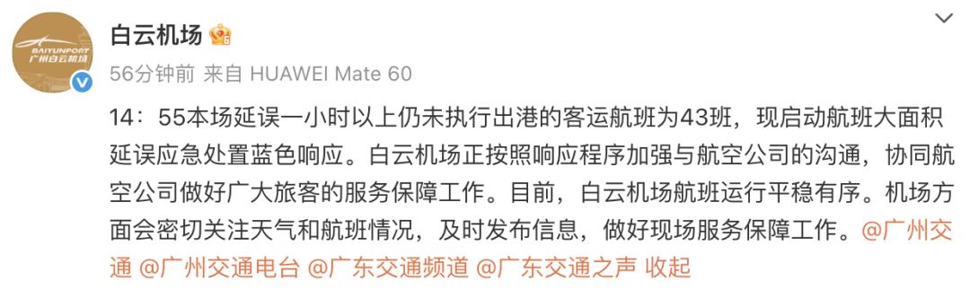 原标题:《超400架次!白云机场大面积延误!最新消息→》