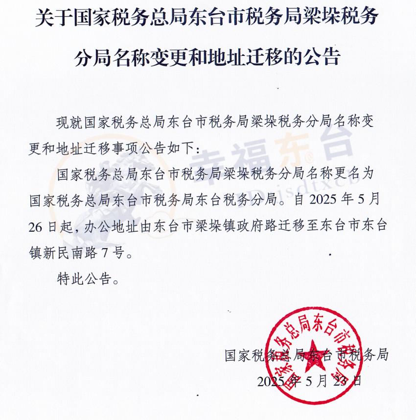 现就国家税务总局东台市税务局梁垛税务分局名称变更和地址迁移事项公告如下: