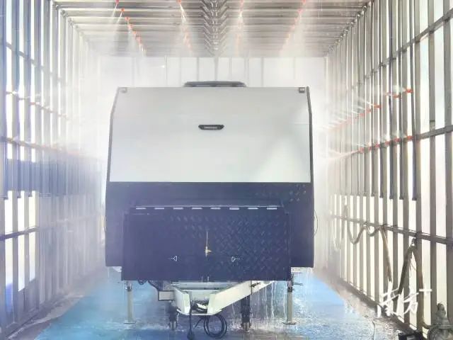 在奇拓企业房车试水区,拖挂式房车成品正进行防水测试。 南方+ 张秀蓝 拍摄另一边,随着中美关税窗口期的开启,不少三水外贸企业对美业务迎来复苏拐点,从积压订单重启到新增订单激增,从车间昼夜赶工到港口极速抢舱,新一轮的浪潮之下,三水外贸企业能否在本轮贸易湍流中再次稳住航向?