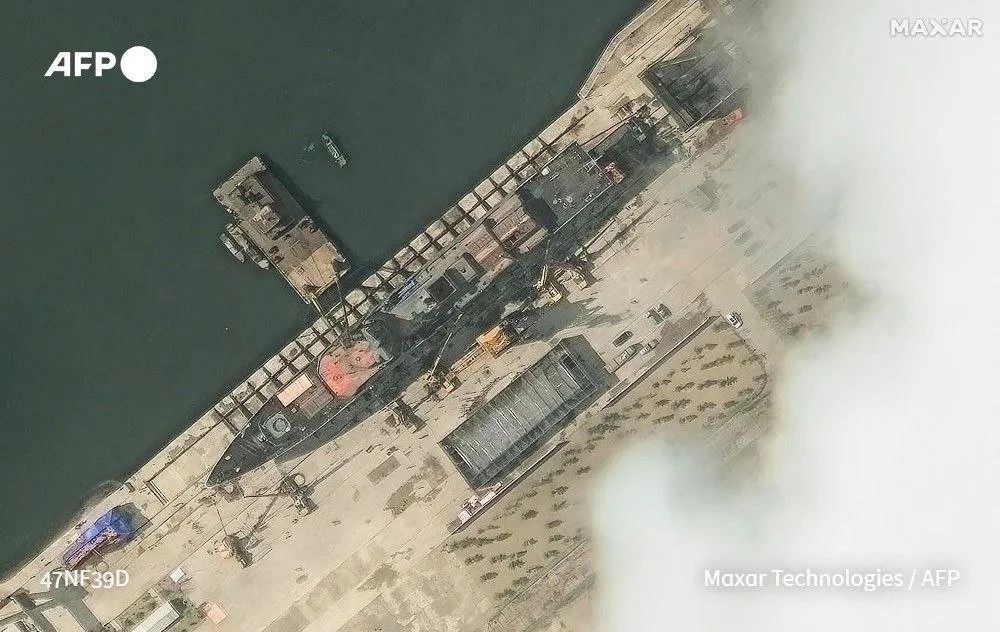 在目前公布的、仅有的一张拍摄于5月22日的卫星照片中,我们可以看到事故发生后第一天时舰船倾斜的严重程度,以及朝鲜方面采取的一系列抢救措施。舰船本身已呈90°向右横在滑道边的水中,舰舯后部已至少有一半没入水面,舰艏大约占全长1/4的部分仍搁置在岸上未能下水。
