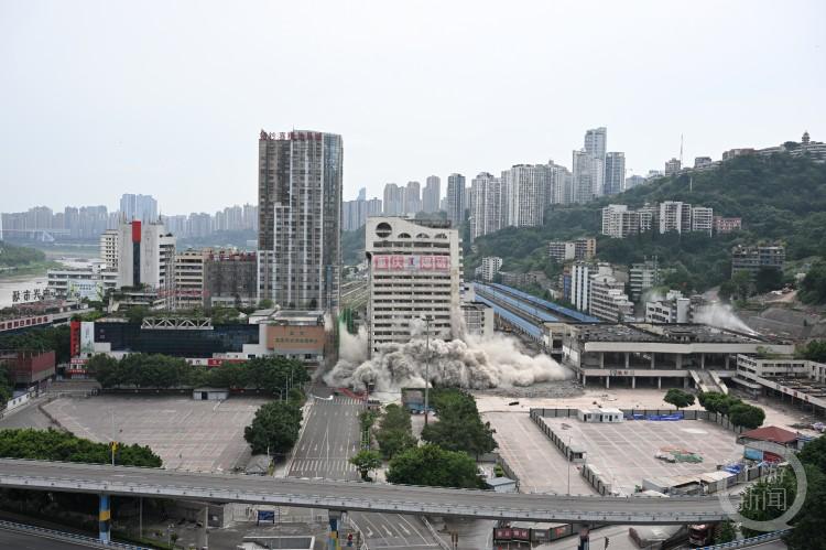 5月25日16时,随着一声令下,重庆站(菜园坝火车站)标志性建筑华铁宾馆在定向爆破的精准操控中缓缓倒下。