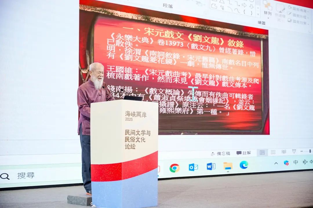 王三庆教授基于对中国、意大利、日本的文献、口述记录及田野调查资料的比较研究,以及将明代工尺曲文转译五线谱的实践,探讨了宋元戏文《刘文龙》在民间文学中的传演及唱曲转译问题。