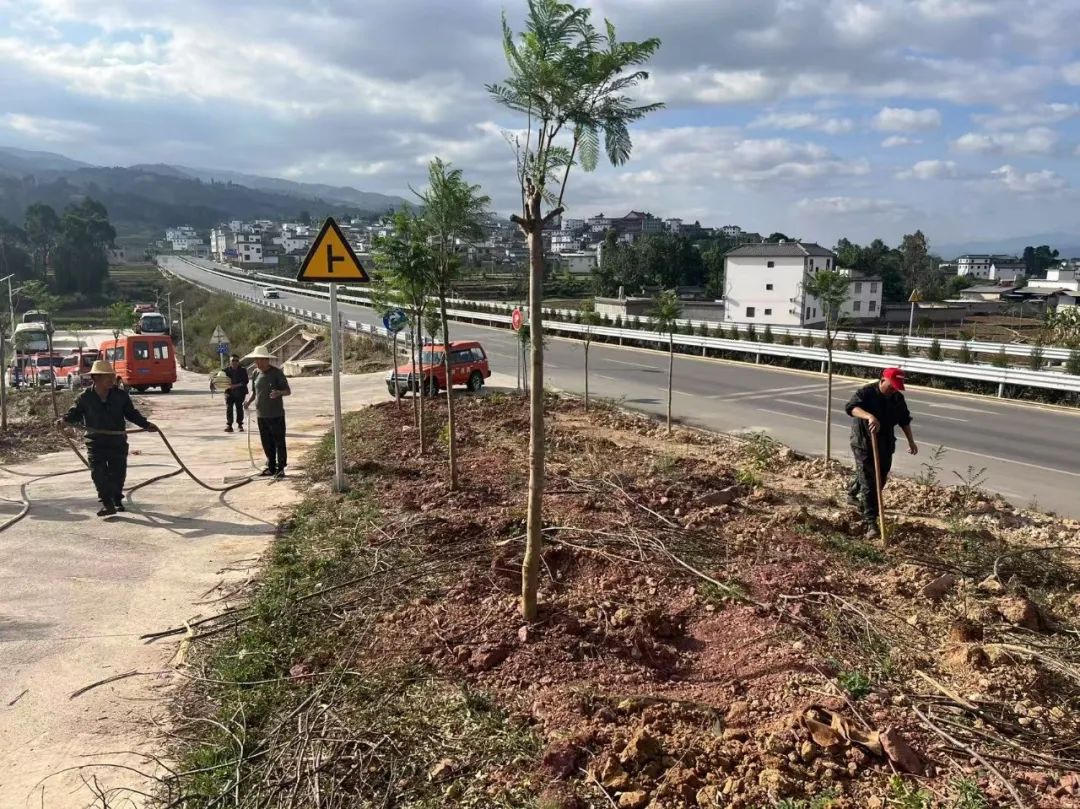 60人齐心协力挖坑、培土、浇水,干得热火朝天,展现了团结就是力量的良好精神风貌。本次植树共计栽种了650棵乡土苗木,品种包括蓝花楹、三角梅、柏树、香樟树、清香木,栽种面积约4亩。据了解,这些树苗不光能绿化乡村,以后还能发展林下经济、搞生态旅游,变成乡村振兴的“绿色银行”。