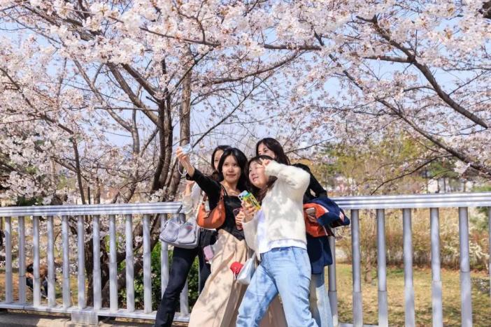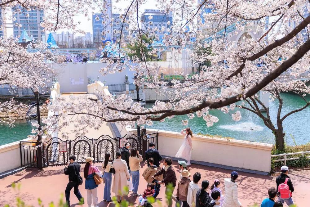 4月6日,人们在韩国首尔石村湖附近赏樱拍照。新华社发(朴晋泽摄)