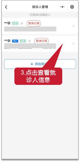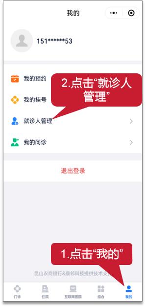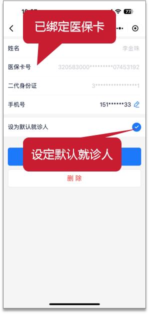 点击“我的—登录/注册—就诊人管理”,可选择或添加就诊人,查看是否绑定医保卡;如未绑定医保卡,则需删除就诊人重新绑定,即可进入医保支付流程。