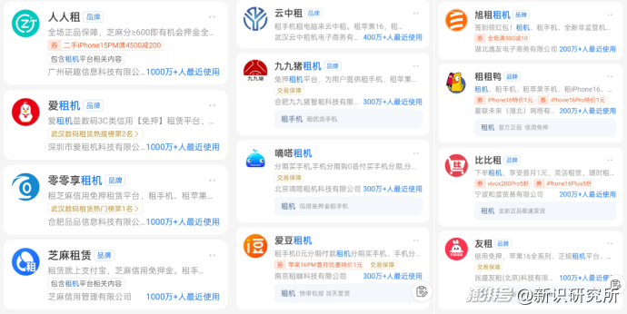 打开微信和支付宝搜索租机,能跳出几十上百个不同的租机品牌。较大的像人人租、爱租机、芝麻租赁、零零享租机这样的品牌,显示最近使用的人数超过千万。而哪怕后排一些,几乎没有听闻的品牌,也有几百万人使用过。