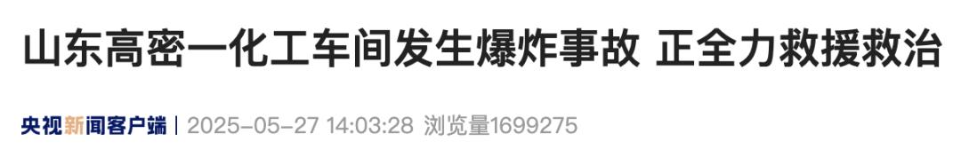 5月27日11时57分左右,山东高密友道化学有限公司一车间发生爆炸事故,正全力组织救援救治。