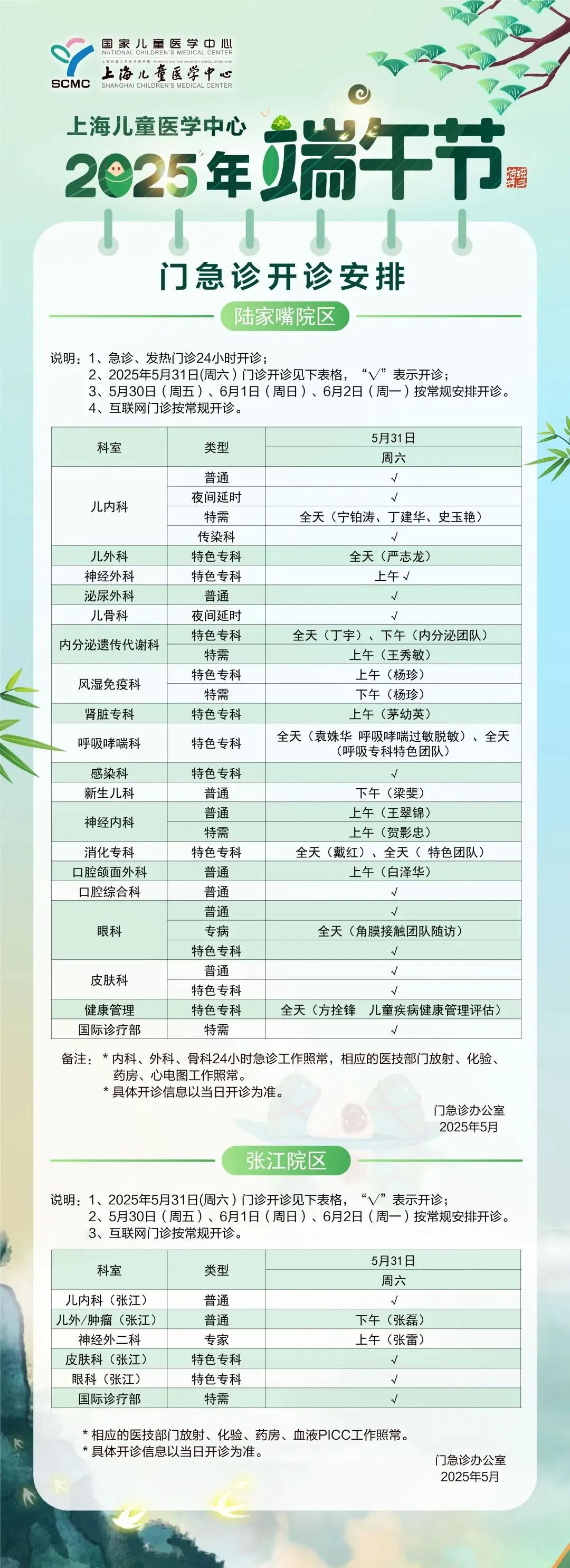 【门诊公告】上海儿童医学中心2025年端午节门急诊开诊安排