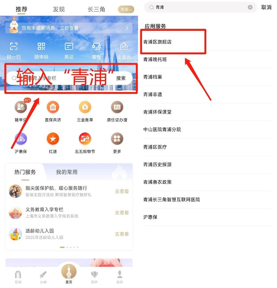 1.家长通过手机登录“随申办”市民云APP、微信小程序或支付宝小程序端,进入“青浦旗舰店”(请在同一端口进行信息登记、报名等操作)