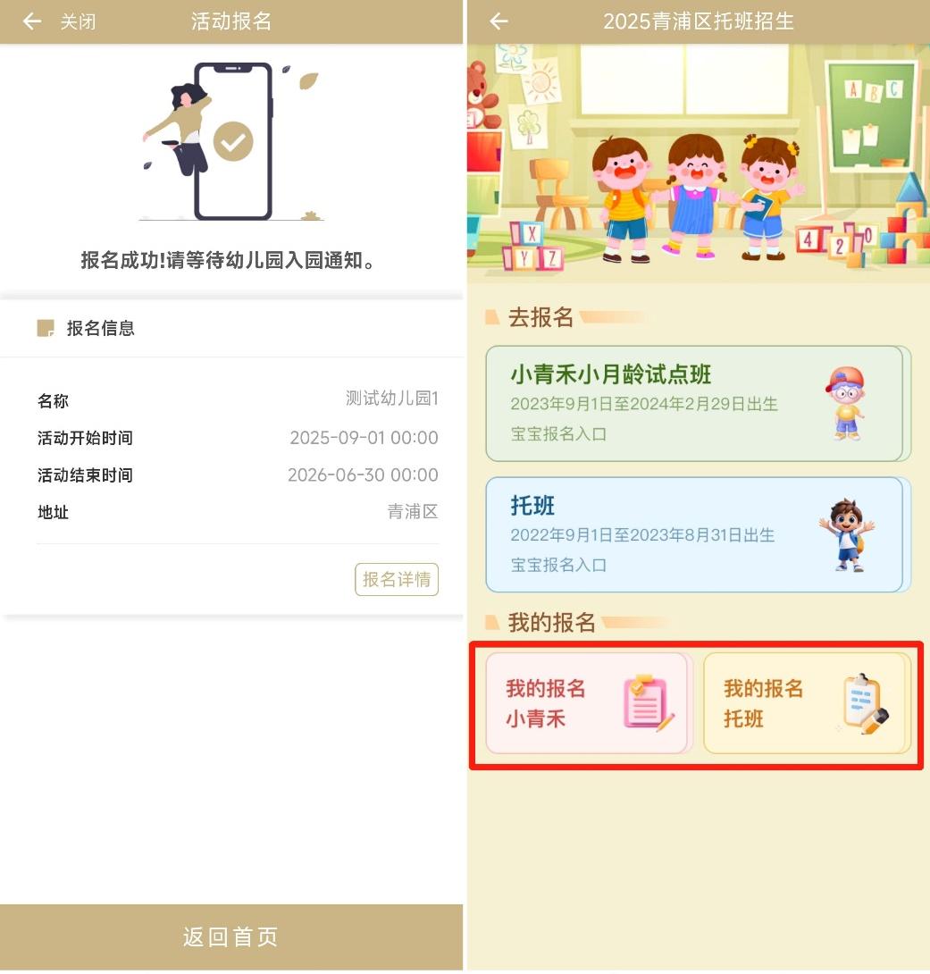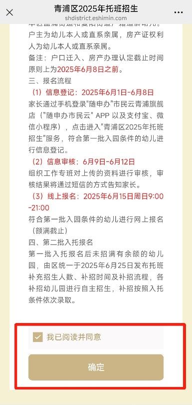 家长通过手机登录"随申办"市民云青浦旗舰店("随申办市民云" APP 以及支付宝、微信小程序),点击进入"青浦区2025年托班招生"服务,符合第一批入园条件的幼儿进行信息登记。